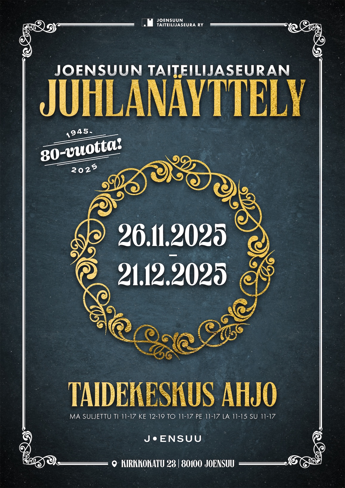 Joensuun Taiteilijaseura ry juhlistaa 80-vuotista taivaltaan juhlanäyttelyllä, joka järjestetään Taidekeskus Ahjossa Joensuussa 26.11.-21.12.2025.